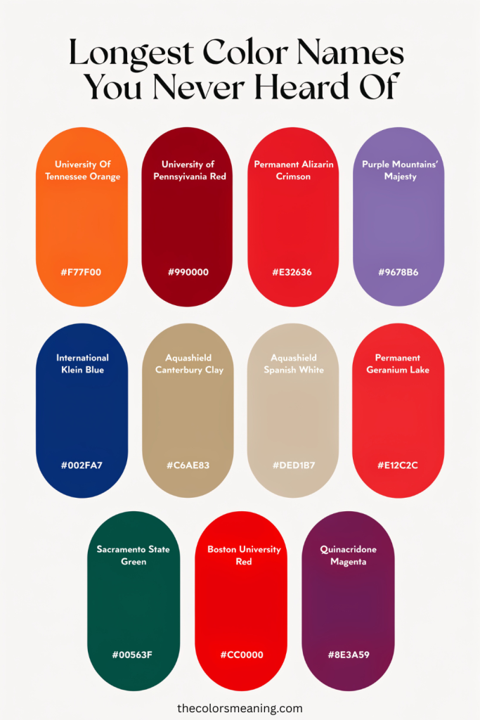 Most of the longest color names captivate people’s attention through creativity and imagination. From Purple Mountains’ Majesty and Quinacridone Magenta to Permanent Alizarin Crimson and Air Superiority Blue, there are many colors that stand out with their long names.